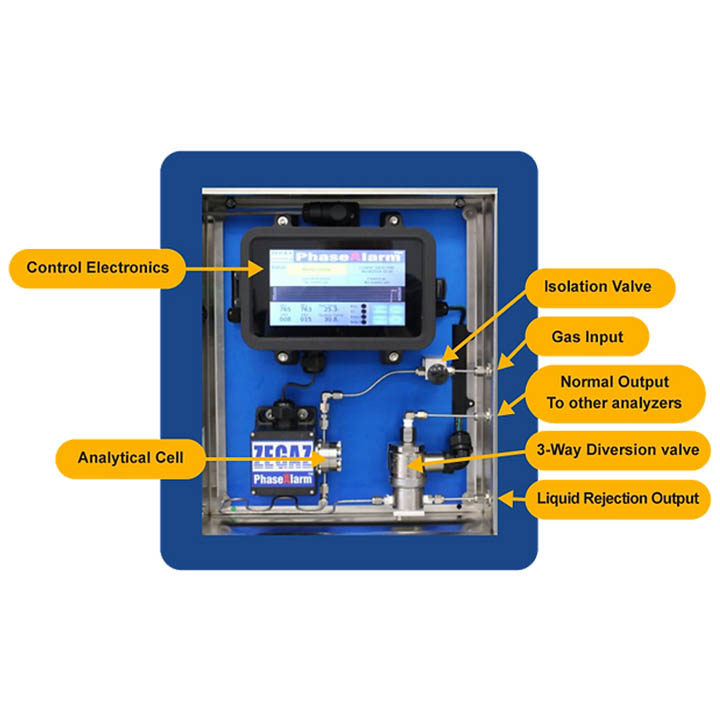 Equipo para la detección de aerosoles y líquidos en las líneas de muestra de cromatógrafos y otros analizadores de gas. Cuando detecta líquido, lo desvía y protege los analizadores. La entrada de líquido en los cromatógrafos de gas es una causa frecuente de averías y fallos que provoca largos tiempos de parada de los equipos.